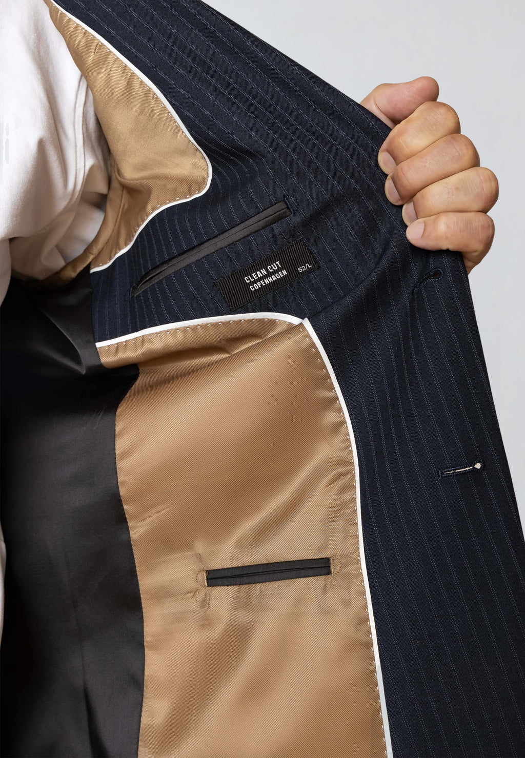 A timeless classic, this pinstripe blazer features a sleek two-button closure, a single vent, and all the refined details that define a true blazer. The fabric includes a touch of stretch, ensuring enhanced comfort and ease of movement.