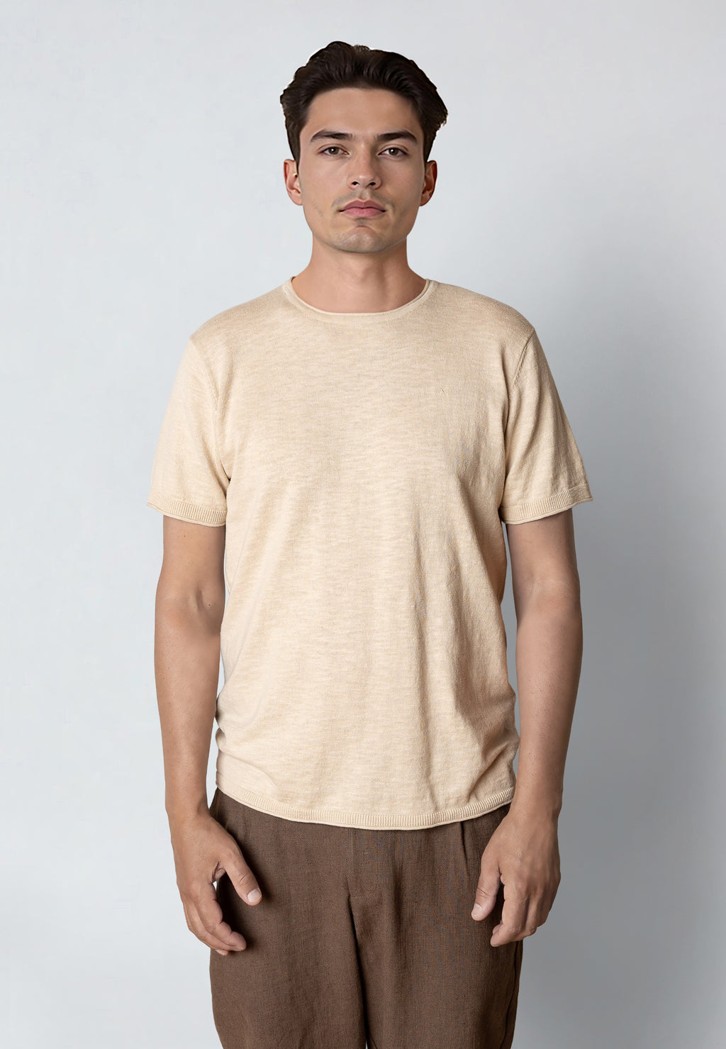 Thomas is a knitted t-shirt crafted from a lovely 100% cotton yarn. It pairs perfectly with both chinos and shorts, designed in a regular fit. The model is wearing size L and stands at 188 cm tall.
