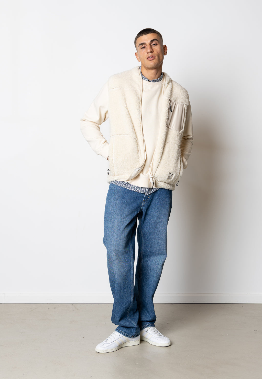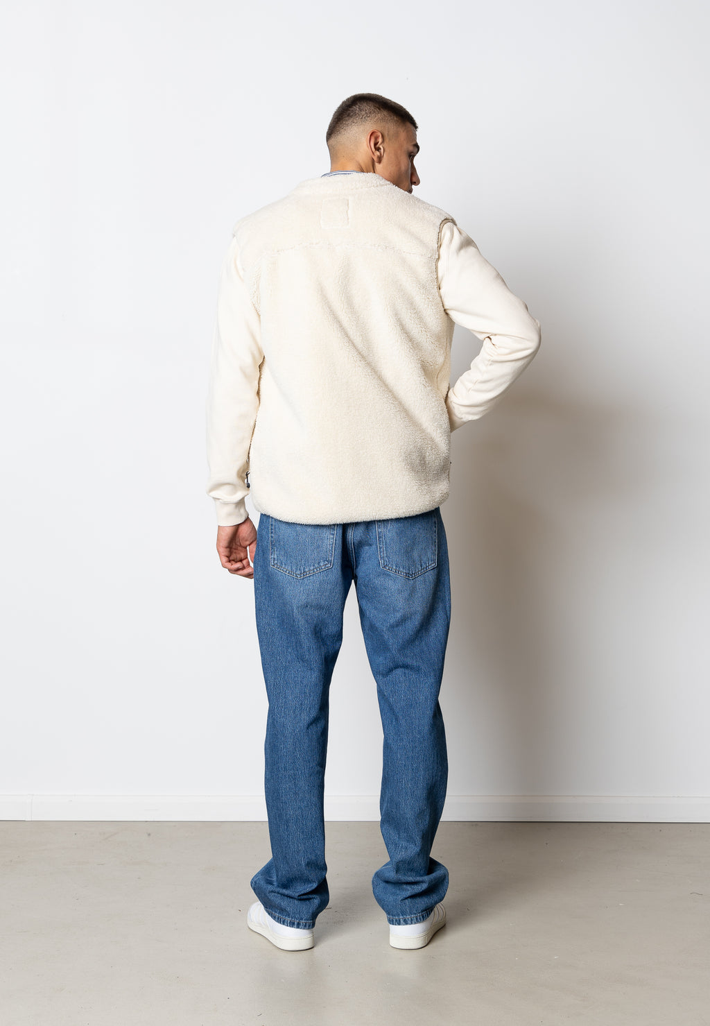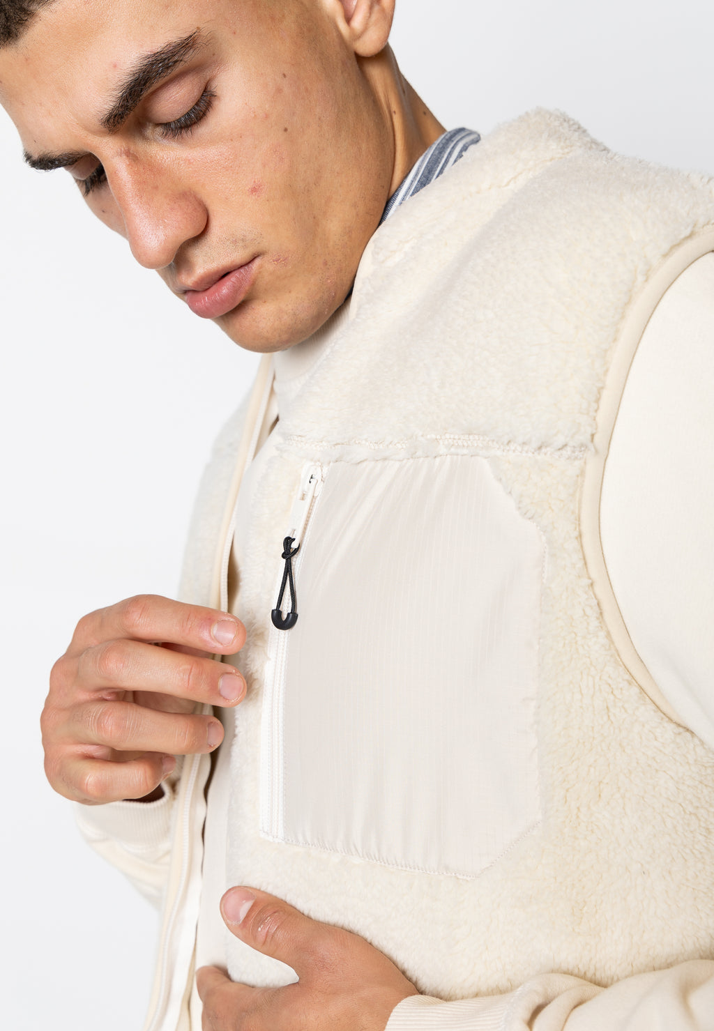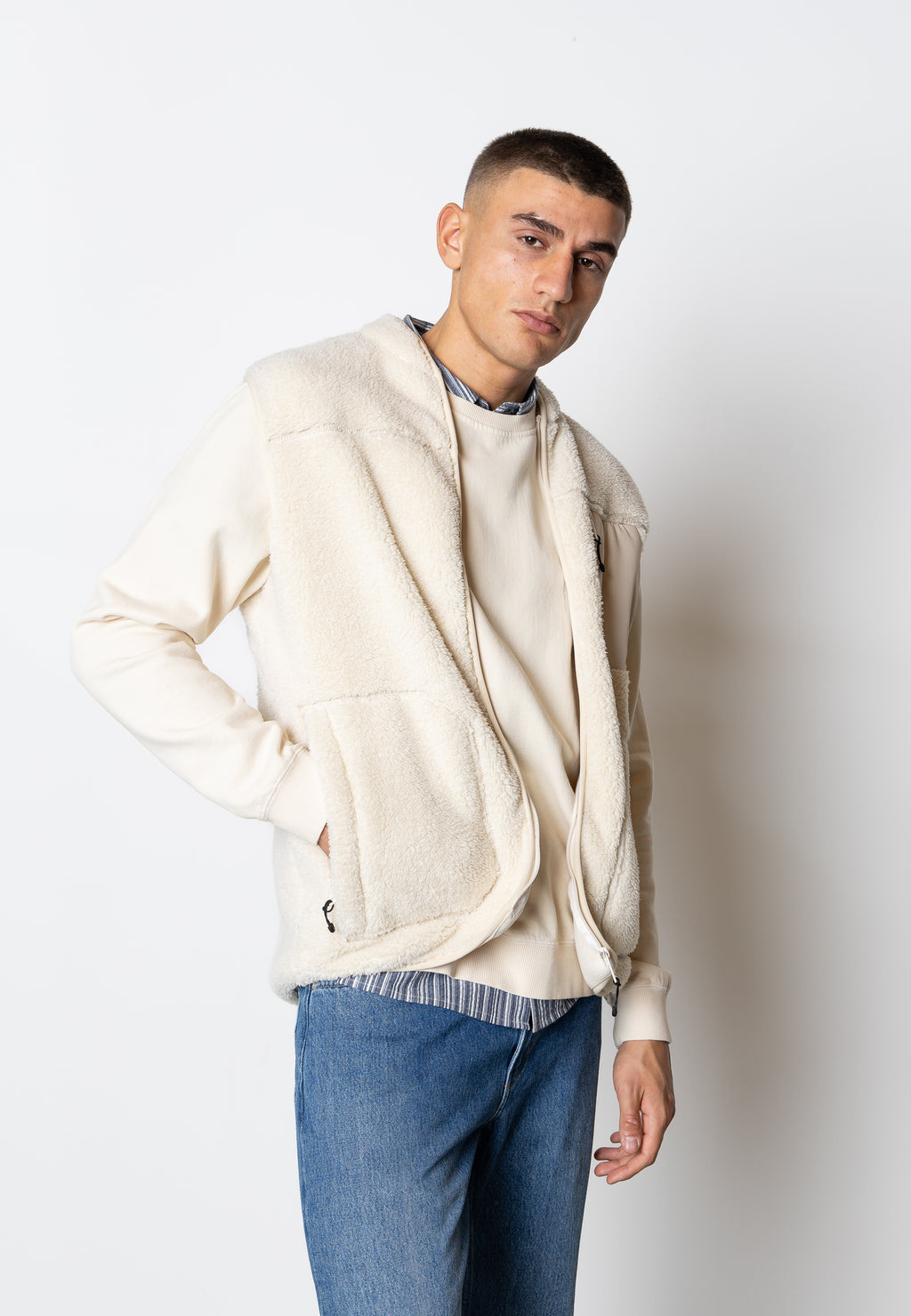 Made of soft nice pine fleece. The Wood fleece vest have side pockets, a small chest pocket with zip and zip closure. The fit is normal/regular. The model wears a size L (188 cm tall).