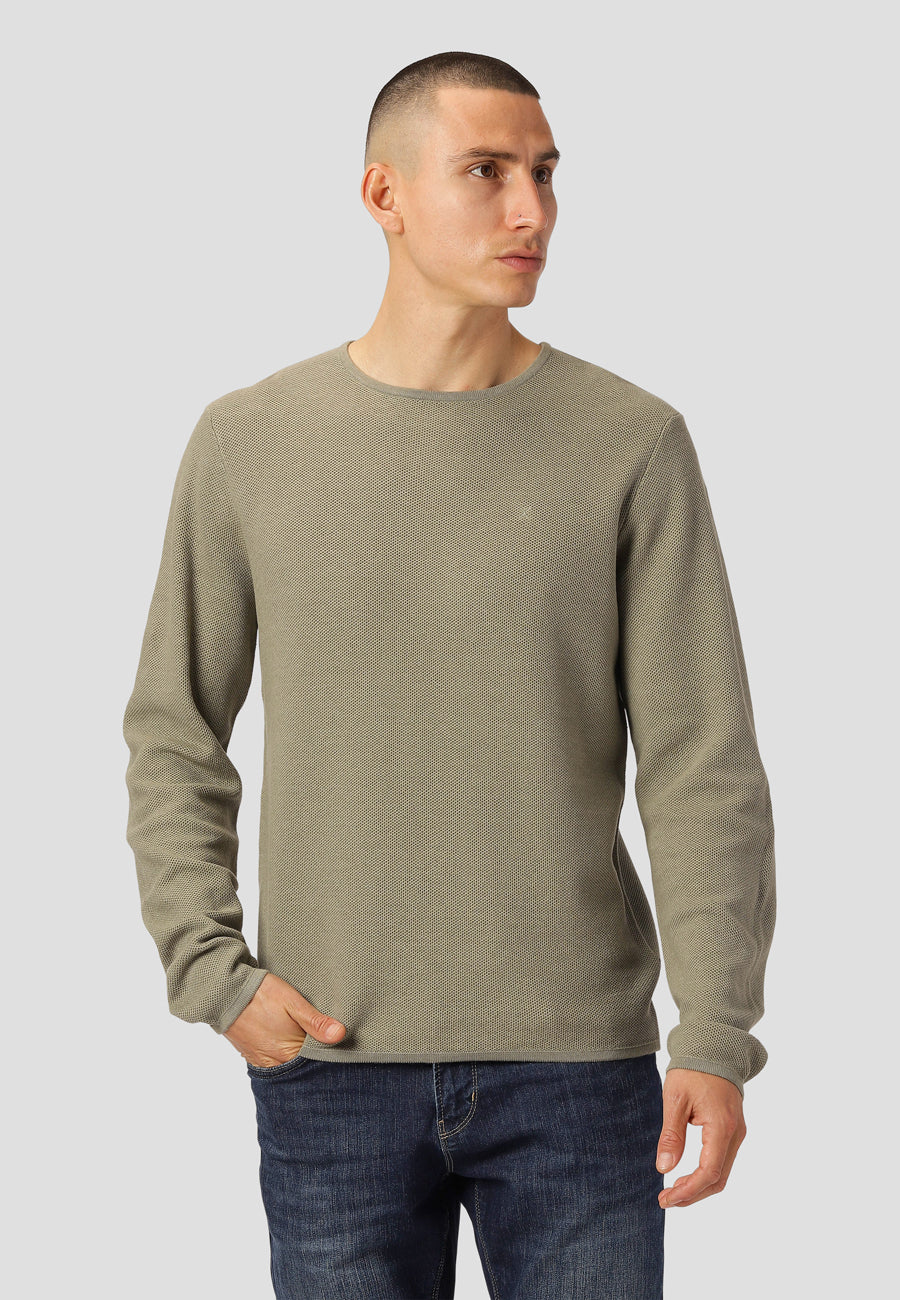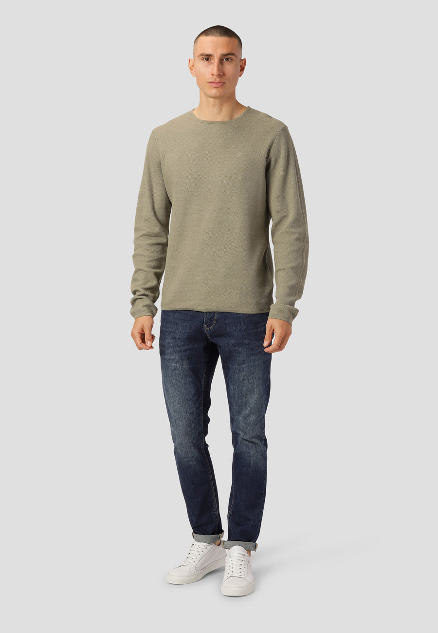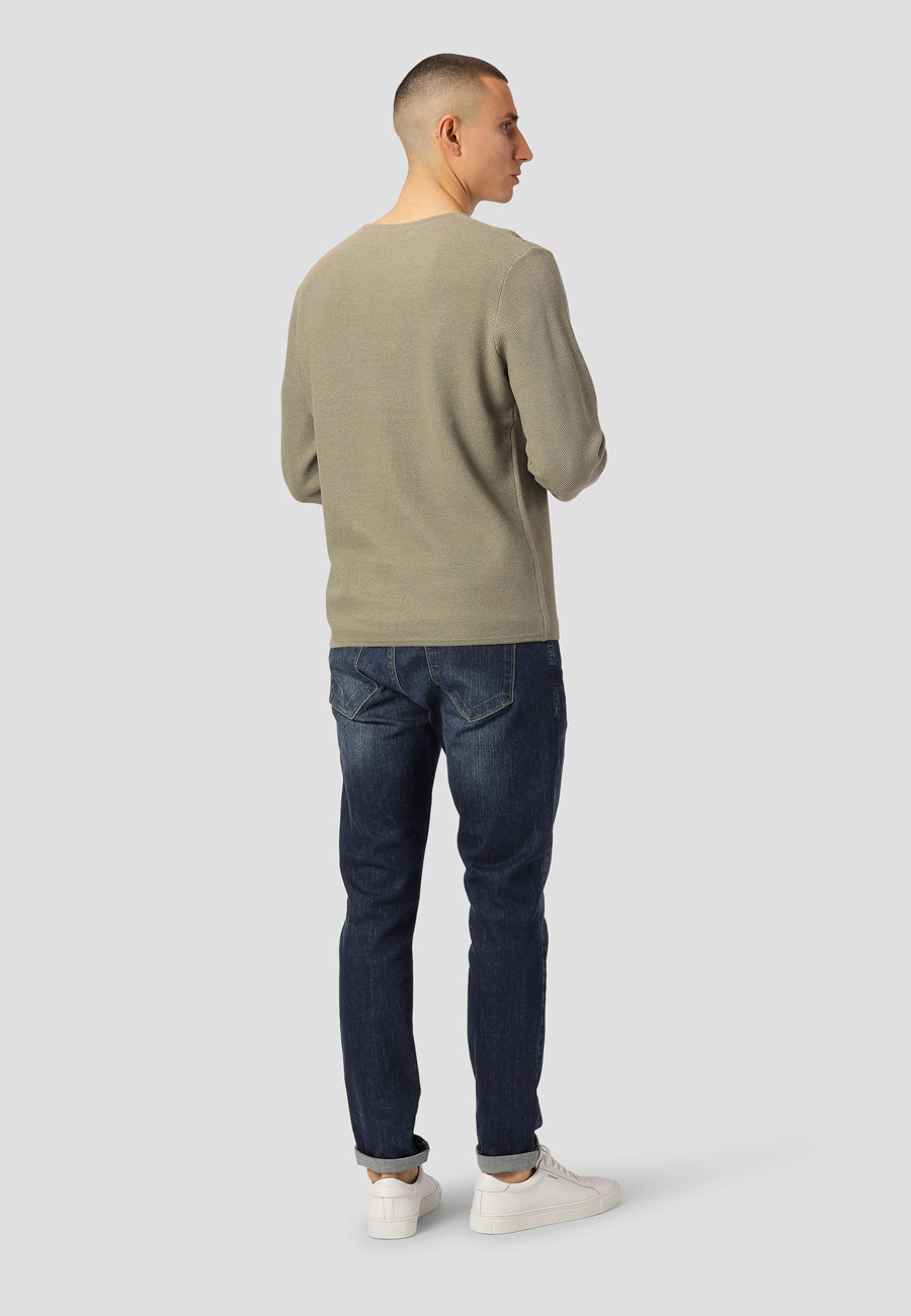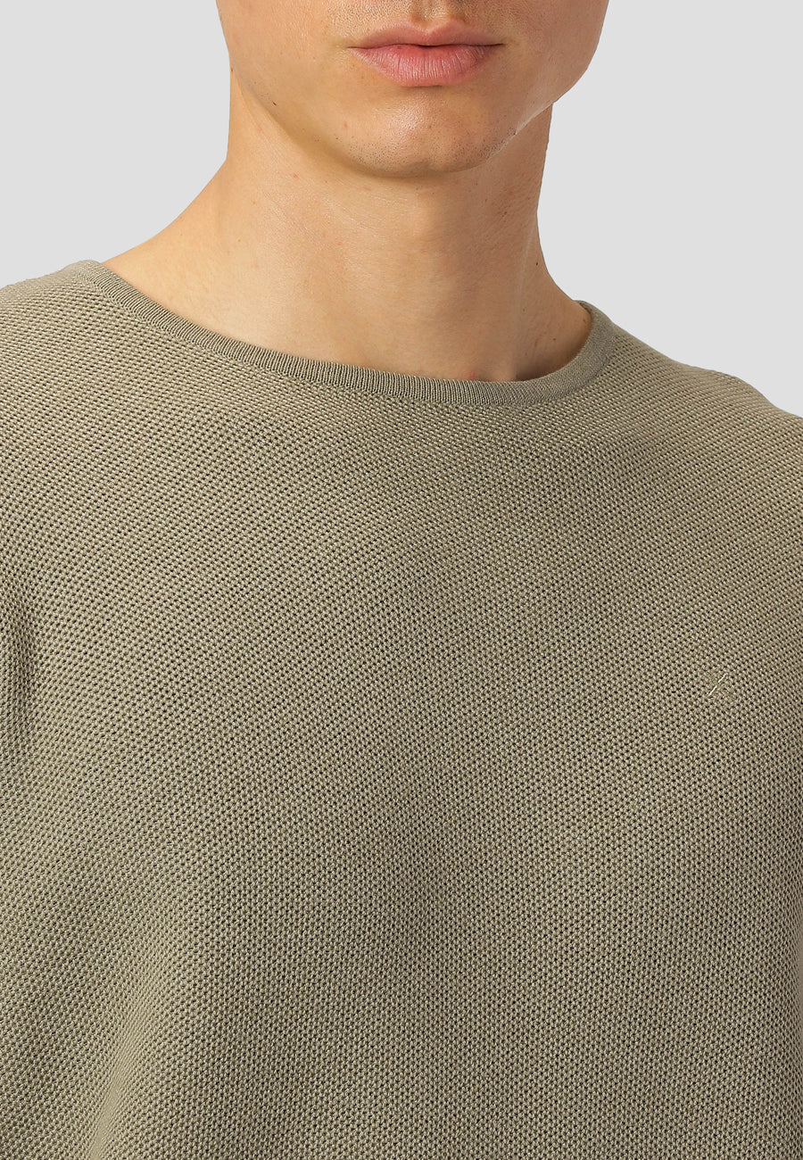 Klassisk strik med struktur som er lavet i 50% recycled bomuld og 50% bomuld.Modellen bærer en størrelse Large