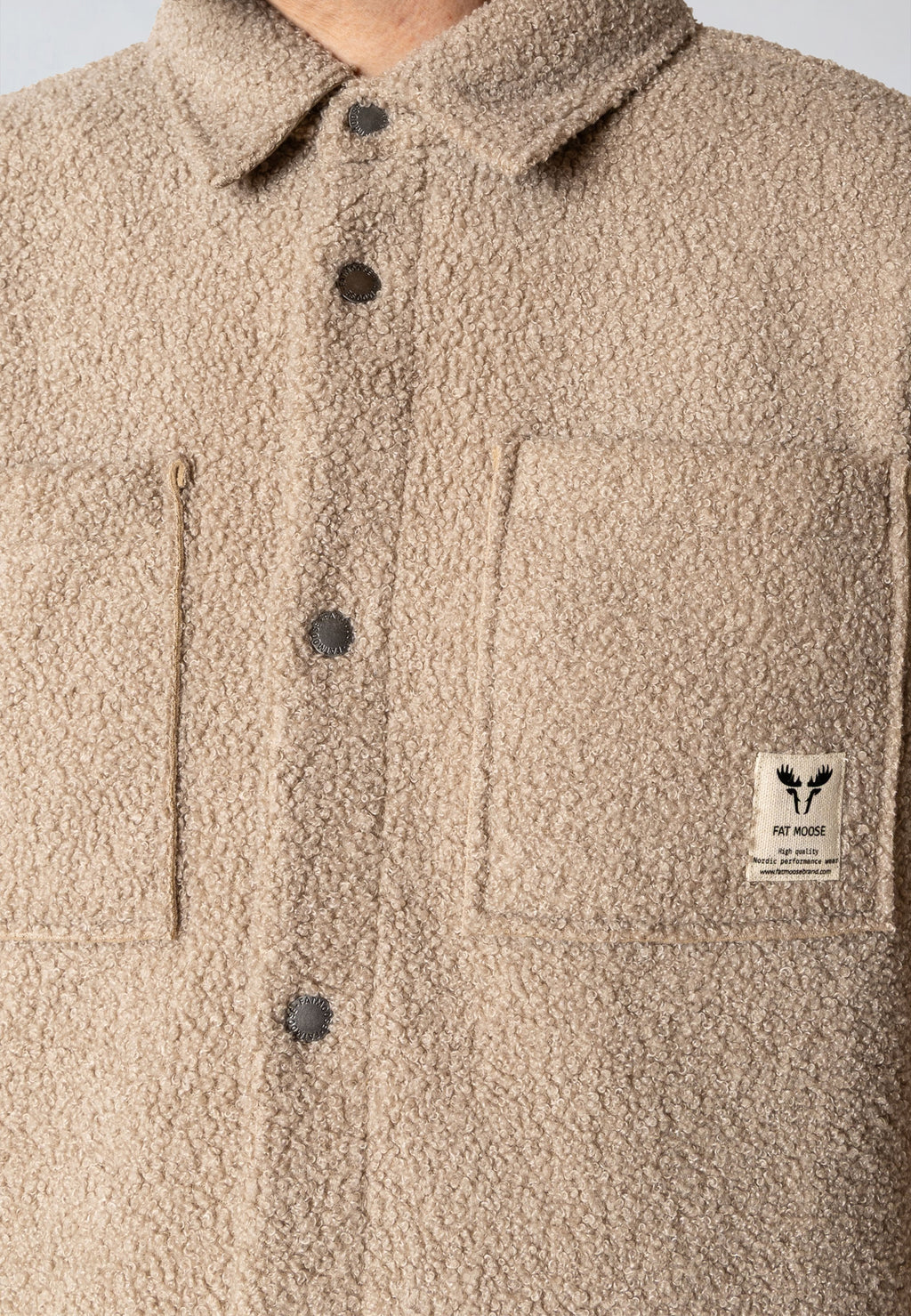 Ace can be worn as a shirt or as an overshirt, for instance over our knitted jumper. It has a relaxed fit and is crafted from boucle fabric, (created from a series of looped fibers). Features push button closure and front pocket.