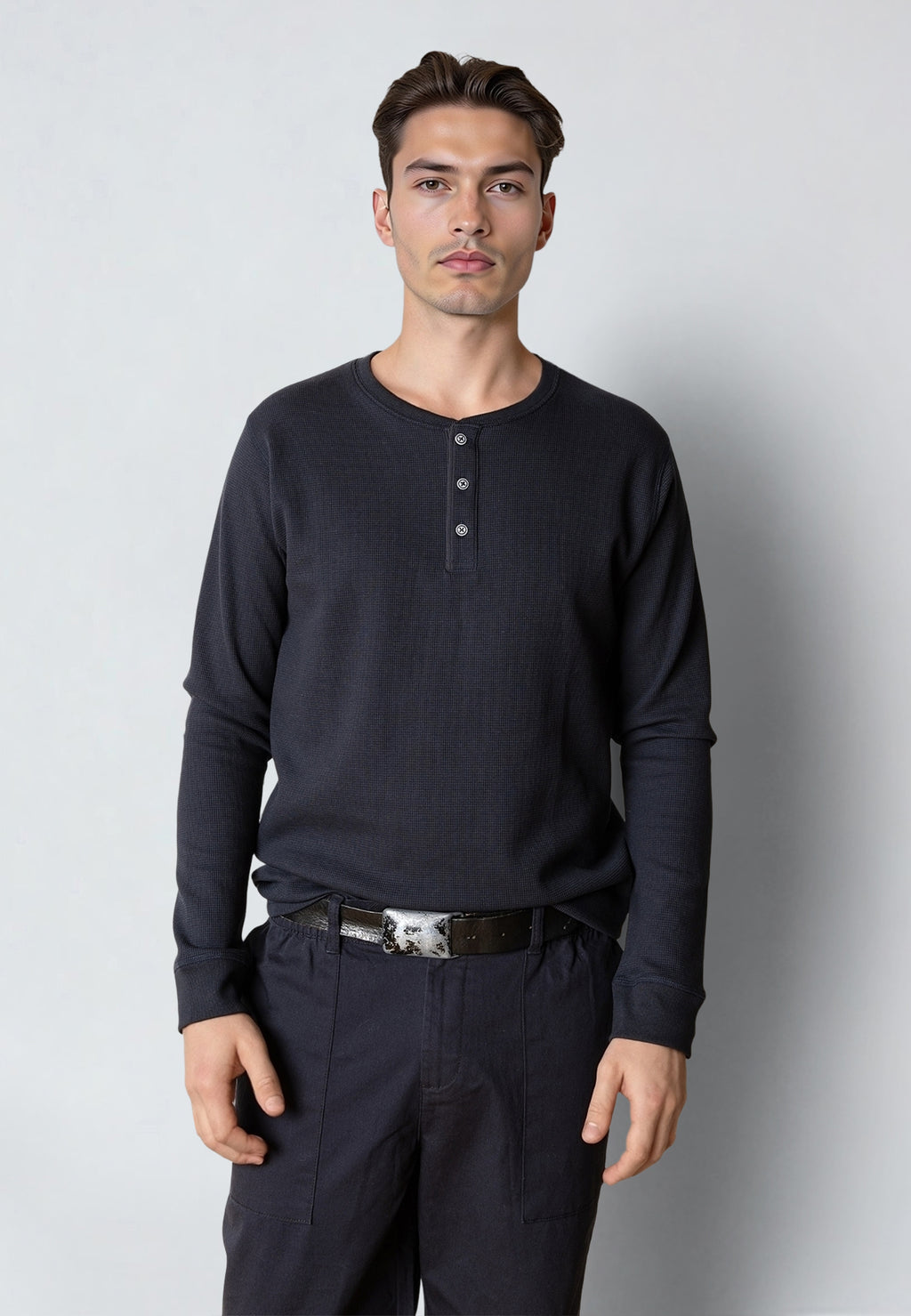 A timeless grandad long-sleeve t-shirt crafted with all the essential details. Featuring a buttoned closure, classic textured fabric, a rounded neckline, and long sleeves, this piece effortlessly blends style and comfort. Designed with a regular fit, it’s perfect for everyday wear.